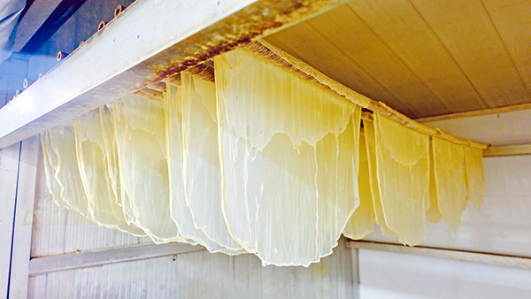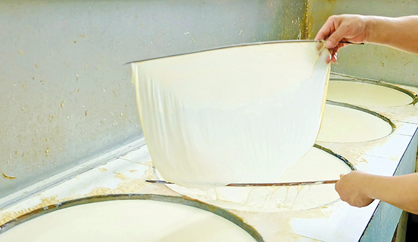在捞皮车间的另一头,有一个烘干机,捞皮师傅将豆腐皮捞上来挂好之后,过一会儿便将其放在烘干机上进行晾干,直到其彻底变成一张薄如蝉翼的豆腐皮。王苏仙说,早前,朱店村人会将豆腐皮放在火上烘干,豆腐皮容易卷起或变脆,如今用蒸汽烘干,豆腐皮能保持良好的柔软度,且干得很快。细看烘干后的豆腐皮,薄如纸,轻如毛,每张豆腐皮基本厚度仅一毫米、重为10克。