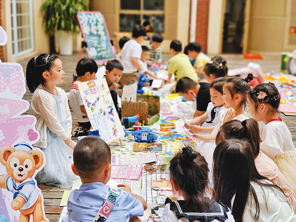 园长经燕燕说,随着电子支付的普及,孩子对于货币越来越陌生,甚至以为买东西只用“刷”一下手机。河畔幼儿园之前举办过多次走进“乌商文化”艺术创想活动,从一开始的“鸡毛换糖”以物易物,到以班级为摊位的练摊拍卖,从用“游园券”到使用真实货币,逐步加深孩子对于“商文化”的认识,也见证了孩子们的成长。(华青)