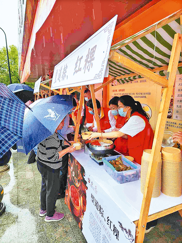 活动现场,除展示“百县千碗”美食图文外,受邀的义乌大酒店工作人员为群众制作了东河肉饼、上溪牛杂汤、望道红糖粽、丹溪醉核桃等“百县千碗”义乌特色美食。这些特色美食也被称为“义乌十碗”,食物的“鲜”赋予了义乌的美,每一口滋味蕴藏着人们割舍不了的乡愁。“老板,给我6个东河肉饼”“给我来一碗核桃羹”……尽管当天雨水不断,市民参与的热情依然高涨。