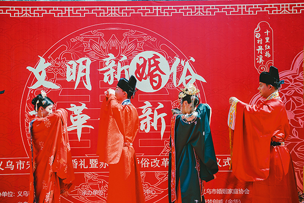 为此,我市积极弘扬节俭美德,大力推动婚俗改革。“婚俗改革已经成为我们工作的重要部分,婚姻登记中心也不再只提供单一的‘领证’服务。”龚君婷介绍,去年8月,义乌被省民政厅确认为全省第二批婚俗改革实验县(市、区)。市婚姻登记中心从2018年起开展免费颁证服务,针对不同节日为新人“定制”特色颁证仪式。同时利用各示范基地举办集体婚礼、简约婚礼等婚俗仪式,引导婚姻当事人自觉摒弃大操大办、铺张浪费等旧俗陋习,形成“重登记、强责任、崇节俭”的婚俗新观念。